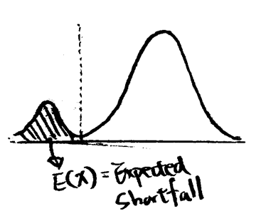 即便用了VaR來預估預期損失,但在預估是假設資產波動呈現常態分佈,然而為了因應厚尾(fat tail)的情況,也就有 Expected Shortfall 的誕生,或者有另一個常聽到的名稱為 Conditional VaR。