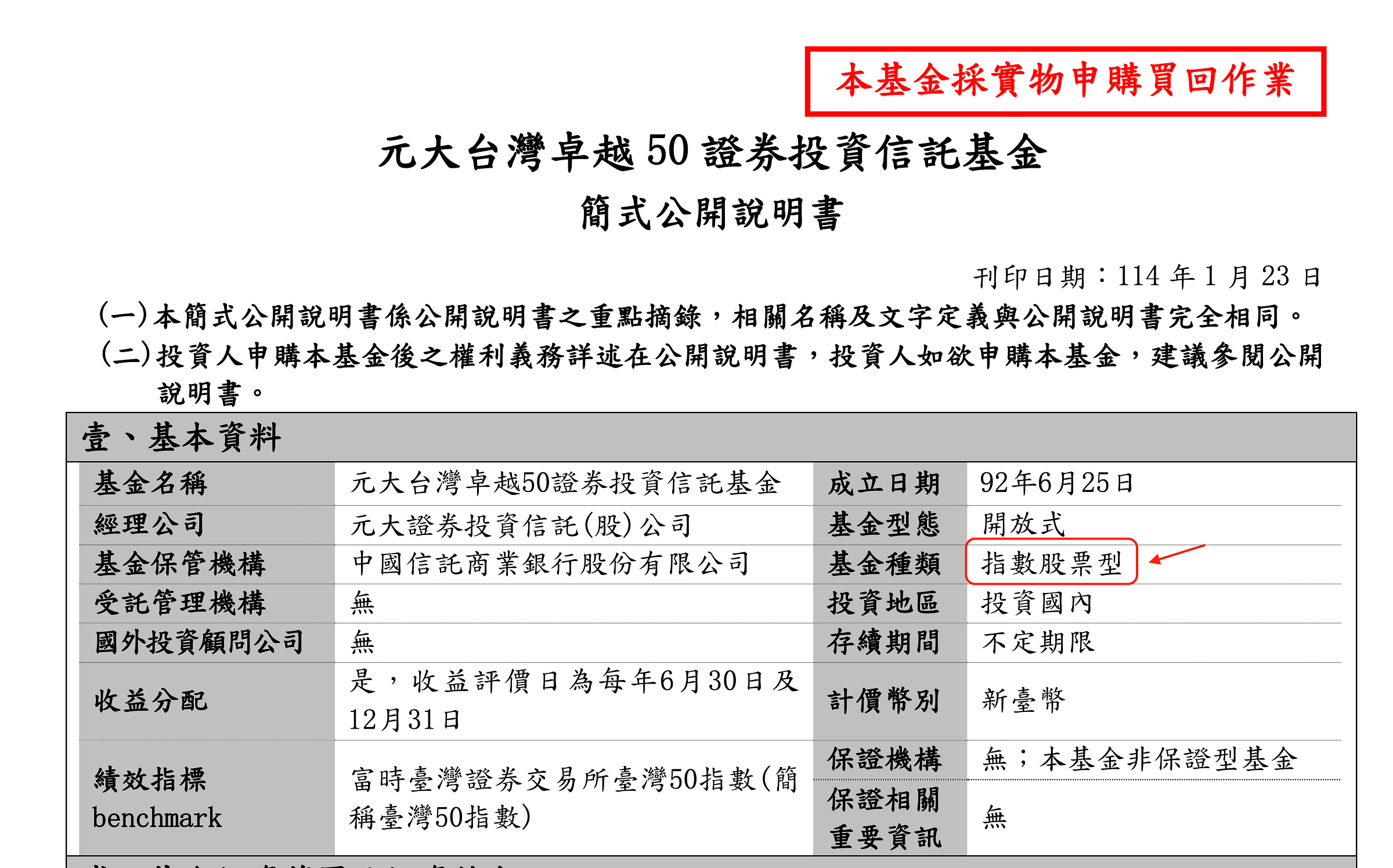 舉例來看,以元大投信發行的元大台灣50ETF公開說明書1為例,就能清楚的看到基金種類為指數股票型基金,績效指標的欄位也清楚寫著臺灣50指數。