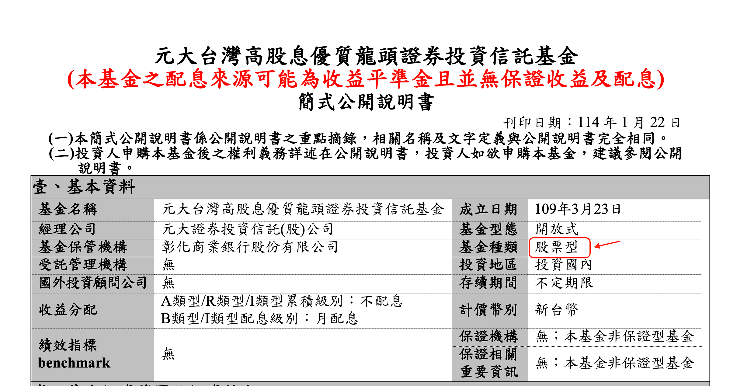 再以另外兩檔基金為例,像元大台灣高股息優質龍頭2,就是典型的股票型基金,以股票作為主要投資標的。