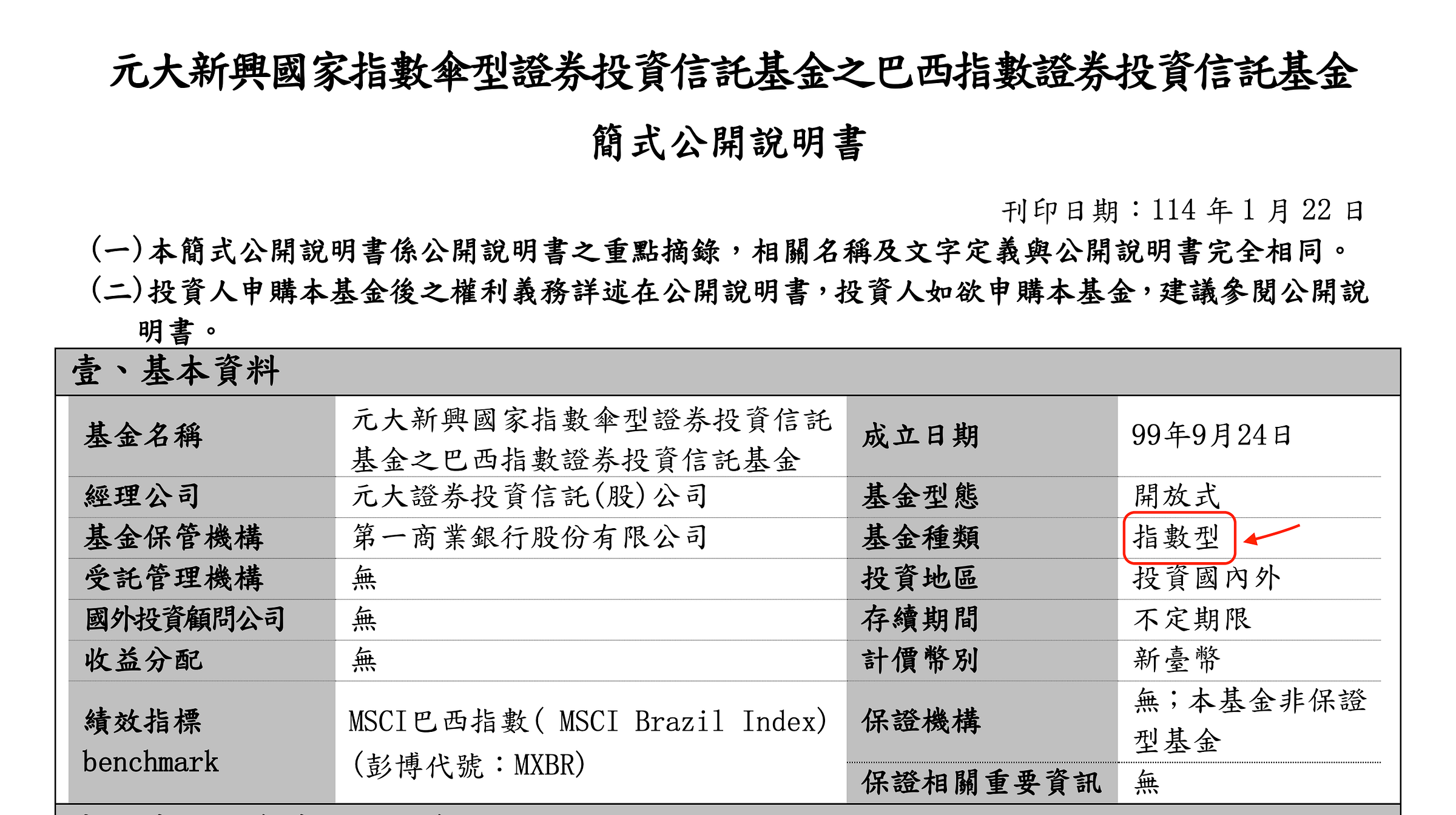 接著再看看元大巴西指數基金3,為一般的基金,但沒有在交易所交易,也是以追蹤指數作為投資目標,因此基金種類為指數型。