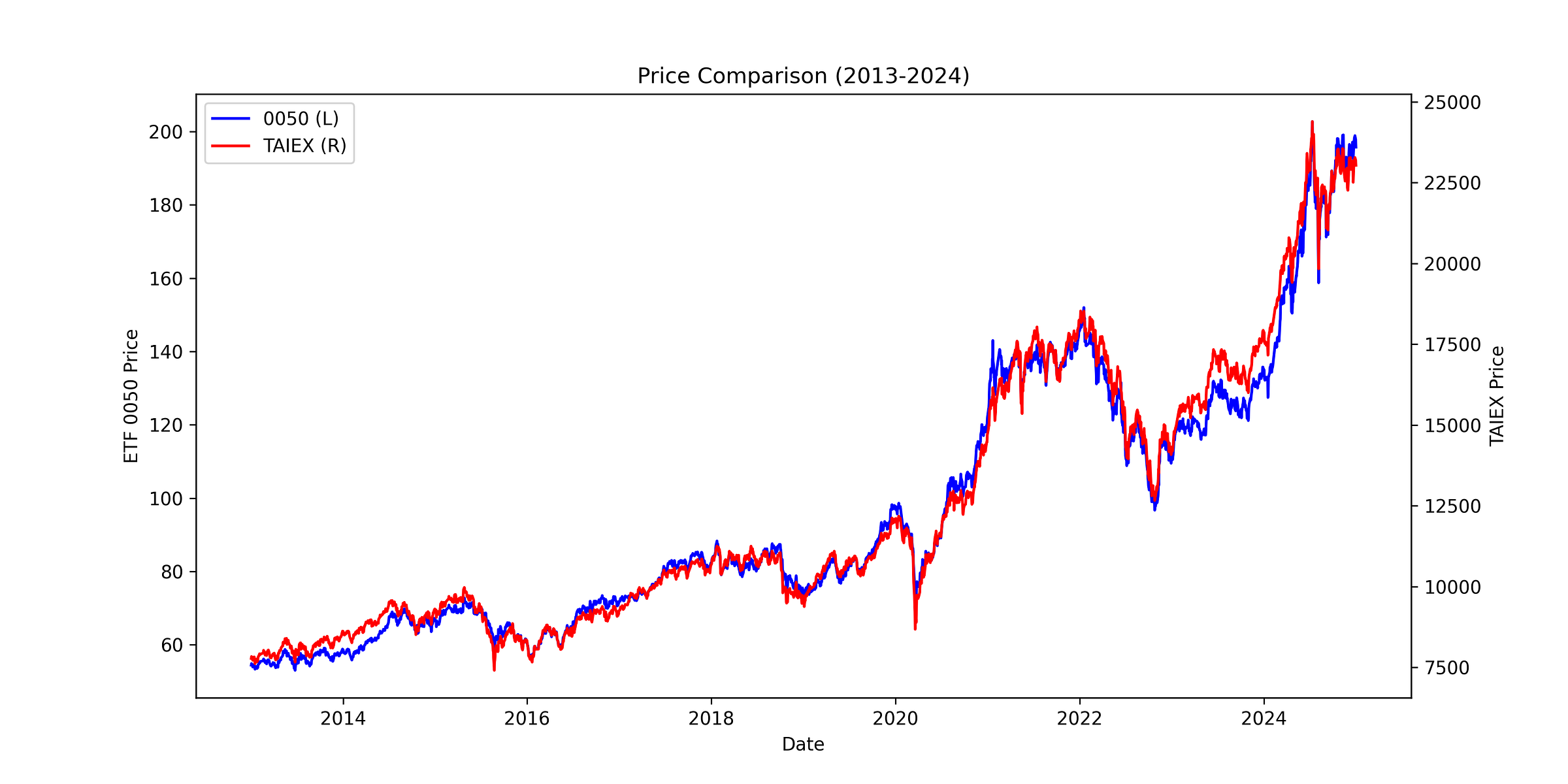 下方用 0050 與加權股價指數比較,可以看到在 2013 年到 2024 年間的走勢雷同,在市場上行或回落的期間,兩者幾乎都是貼近的。