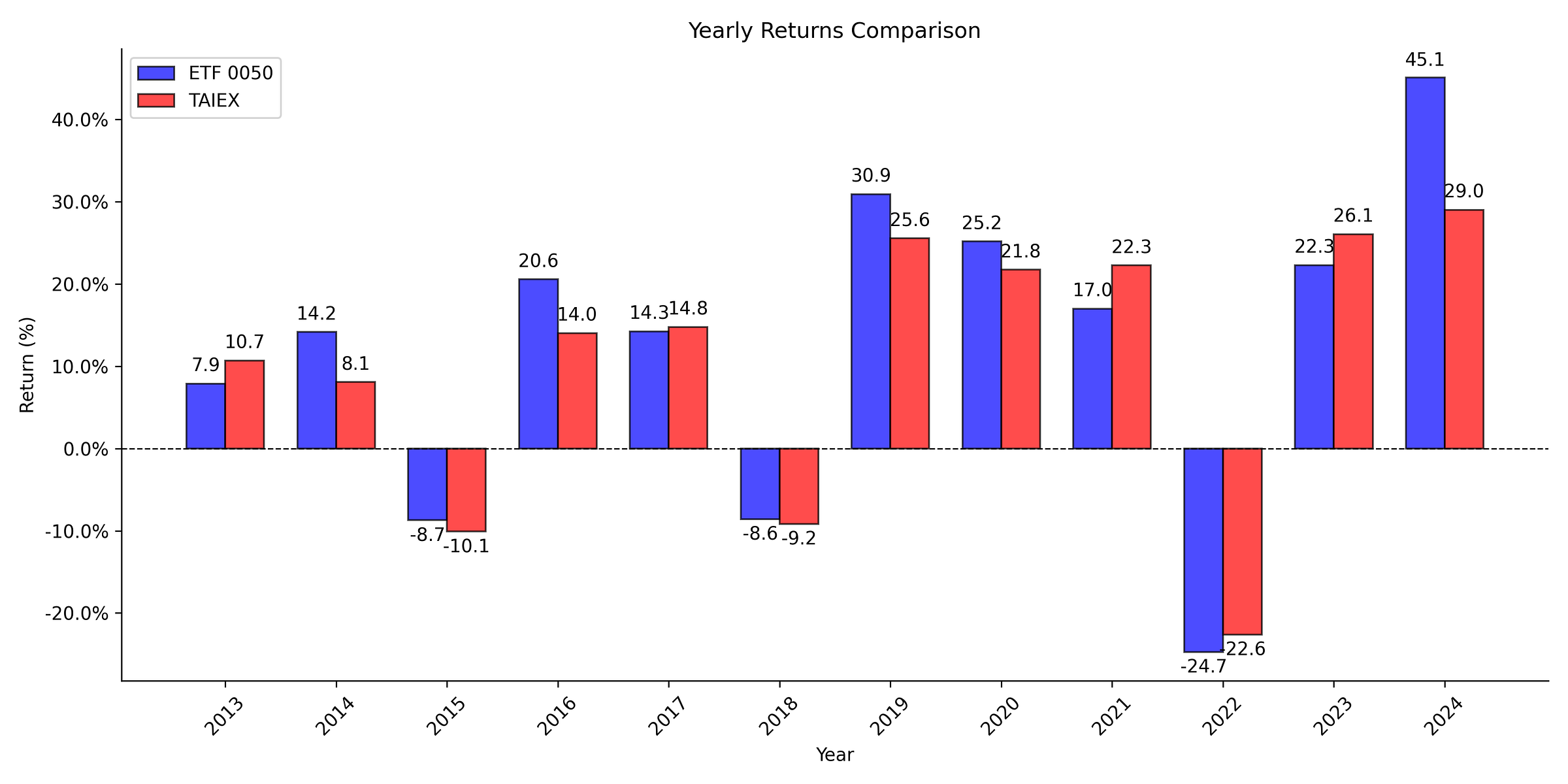 持有 0050 的報酬表現也不俗,在 2024 年甚至大幅超過大盤。