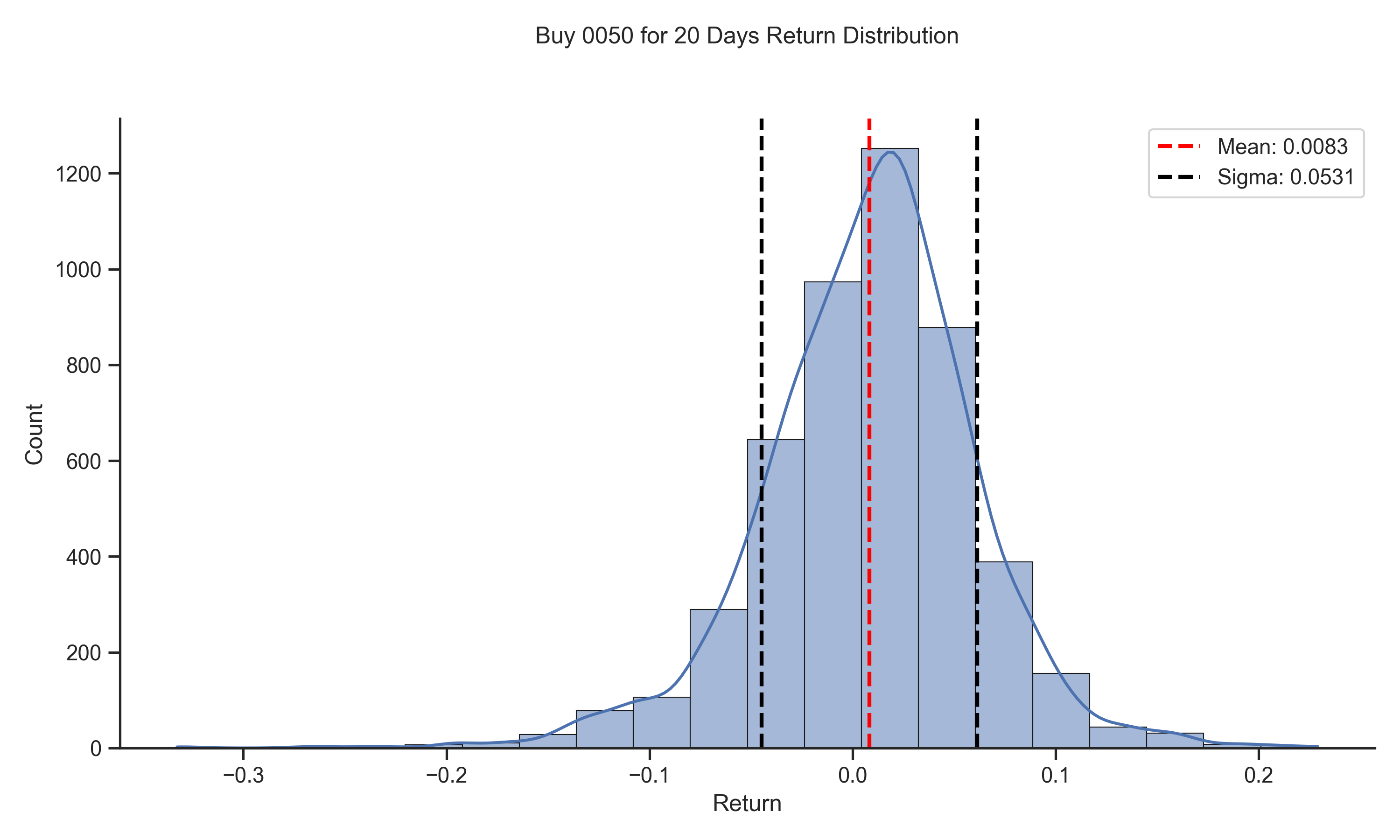 從整體資料來看,在任一交易日買入後並持有 20 天,平均報酬率為 0.8%。