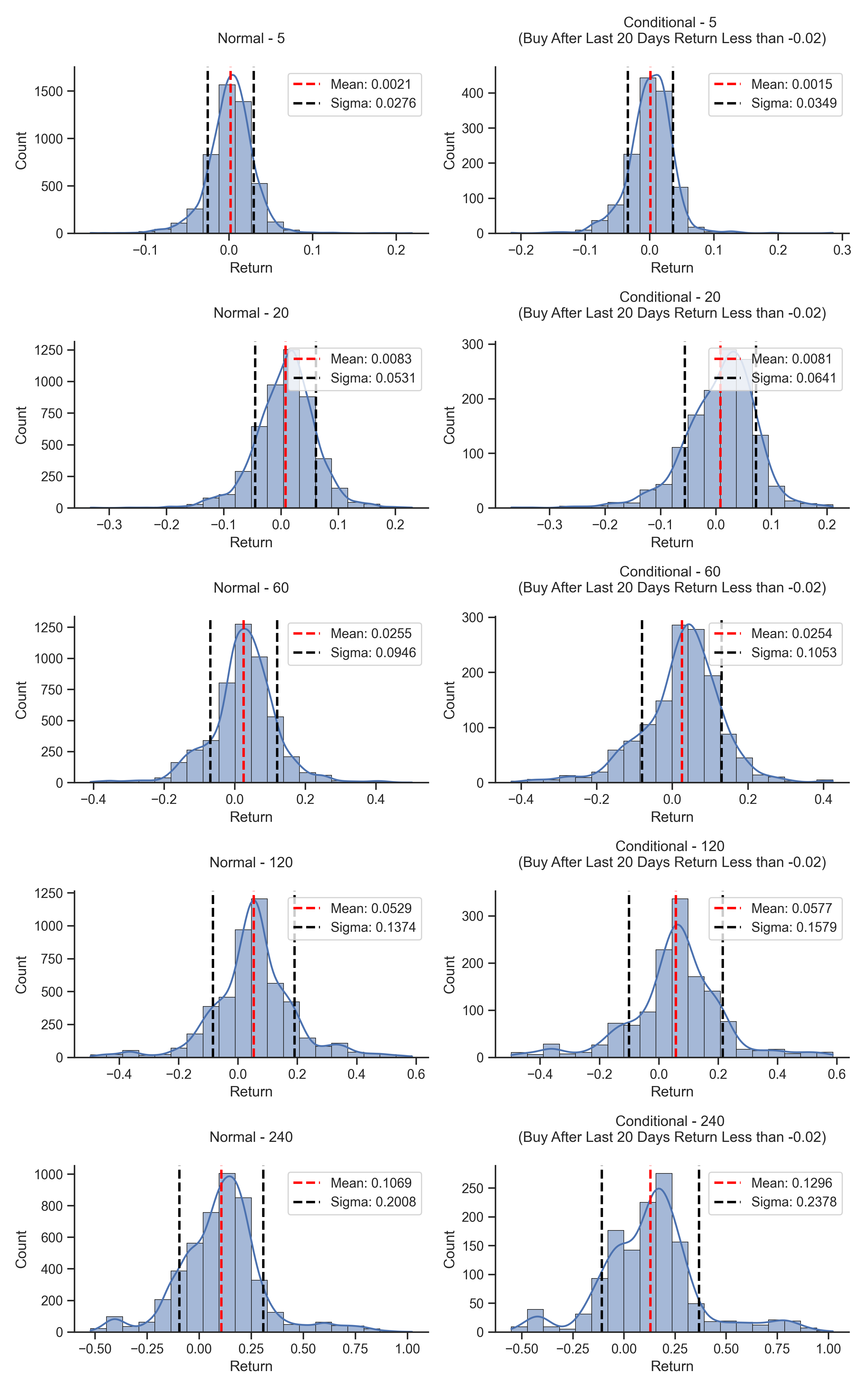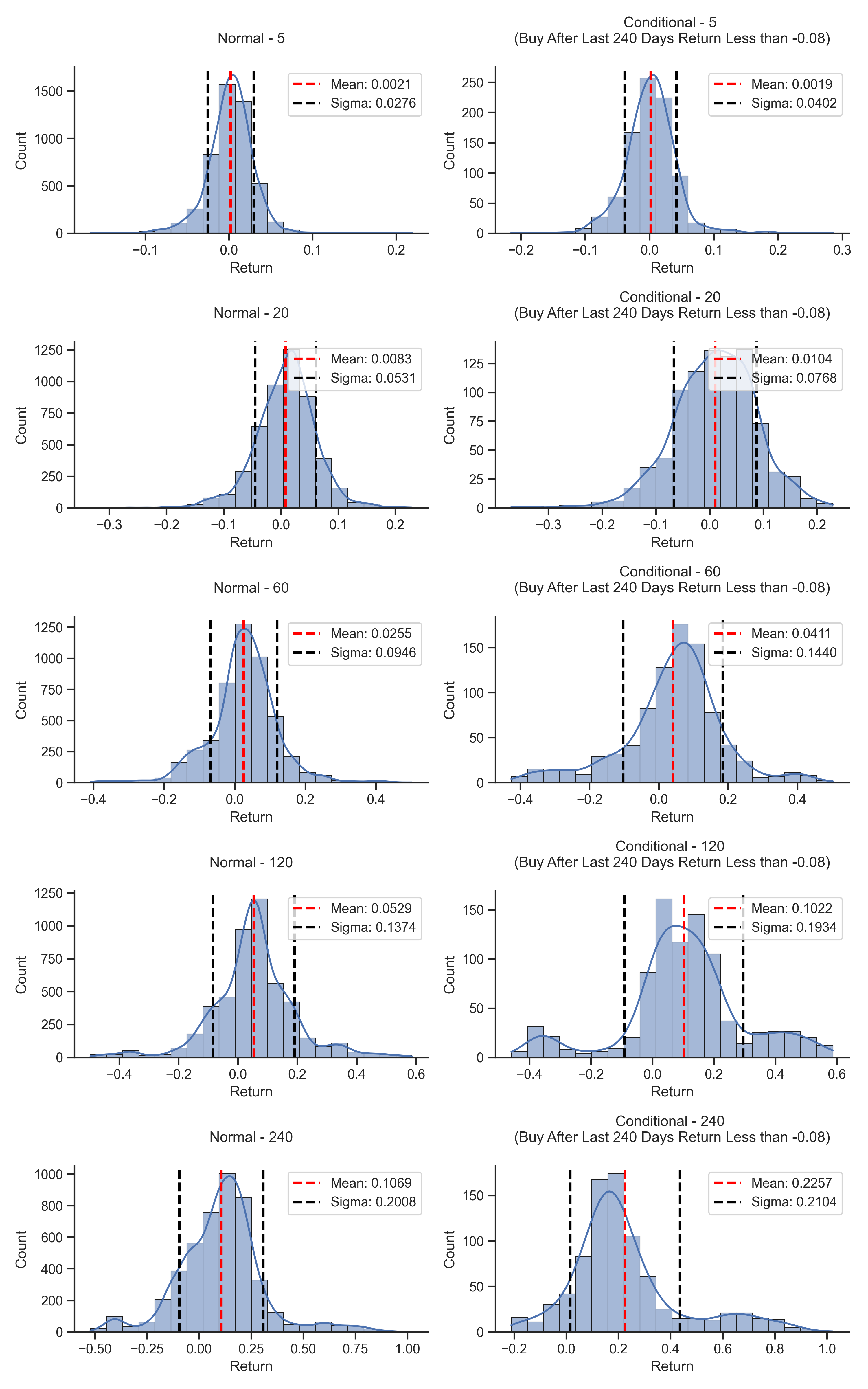 調整後,較短持有期間仍看不出明顯差別,但持有 240 個交易日,報酬率有明顯上升,且報酬率分佈的波動度反而沒有跟著增加。